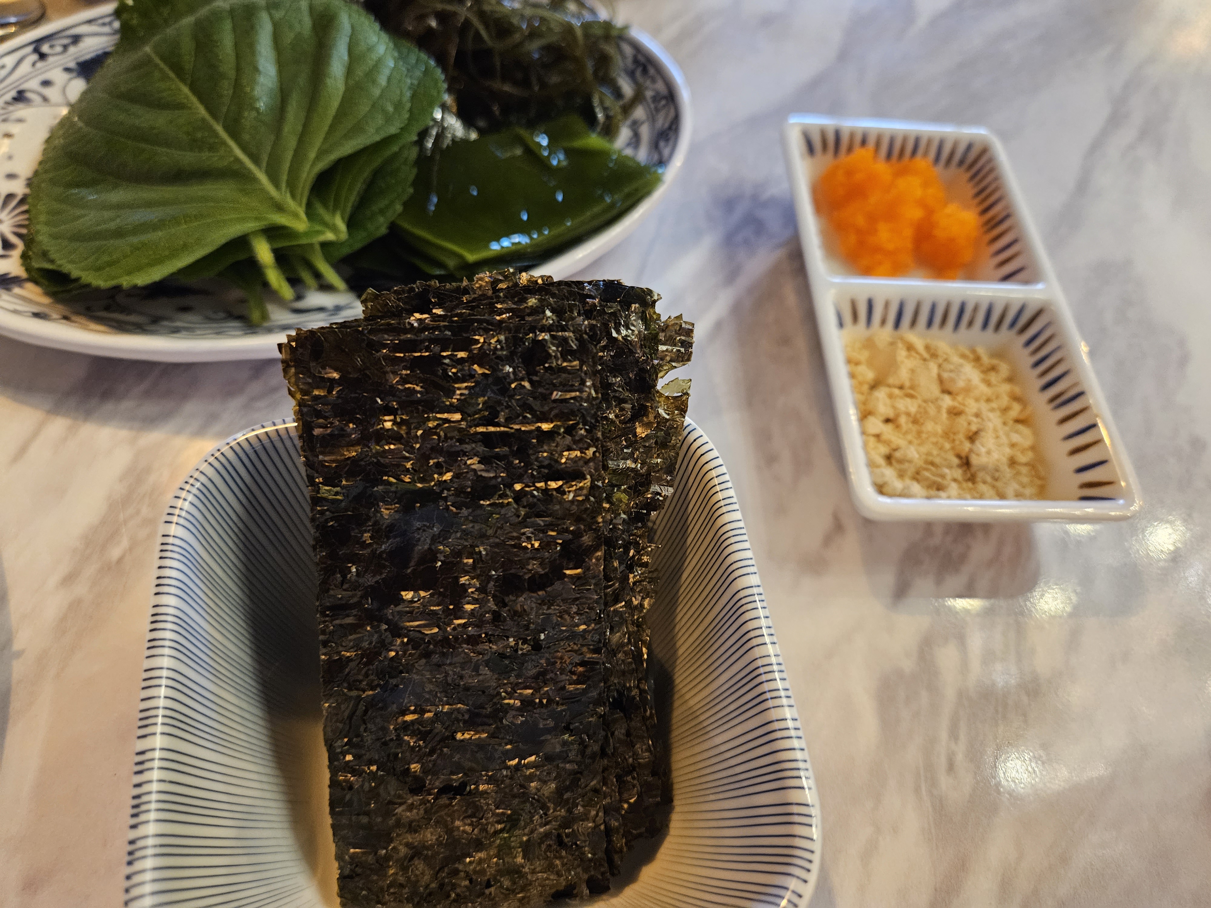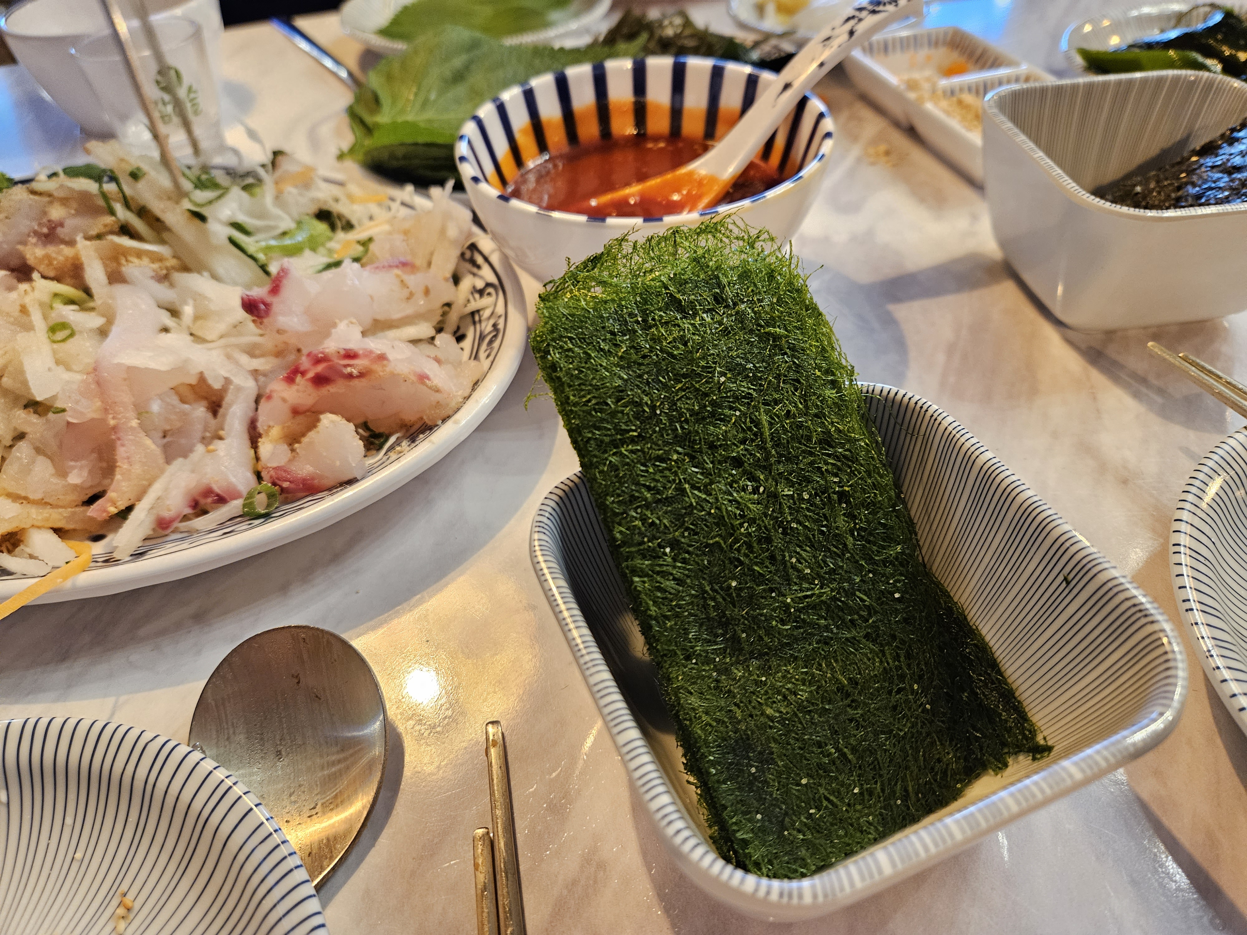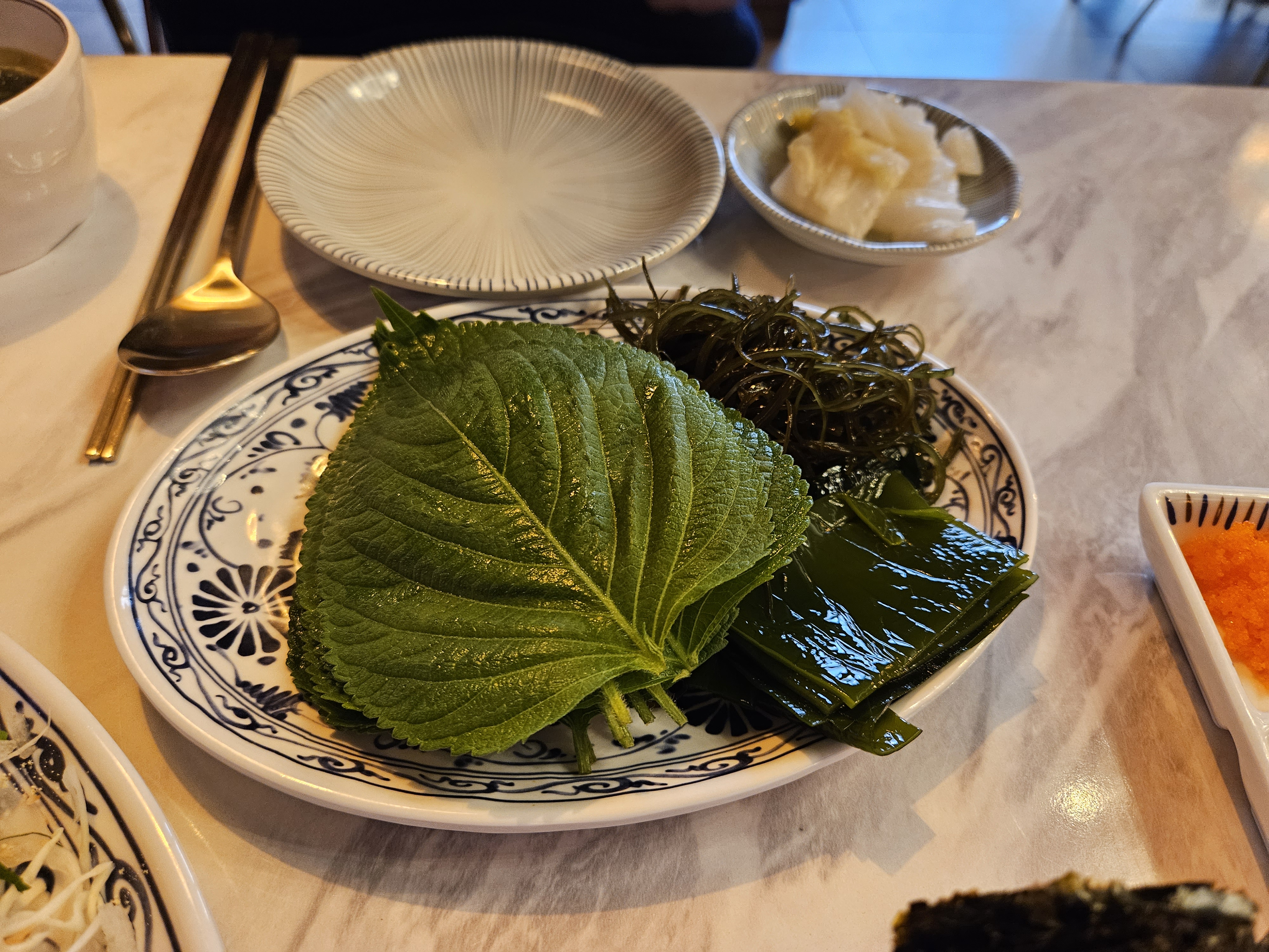 기본 쌈야채로 깻잎, 해초, 다시마도