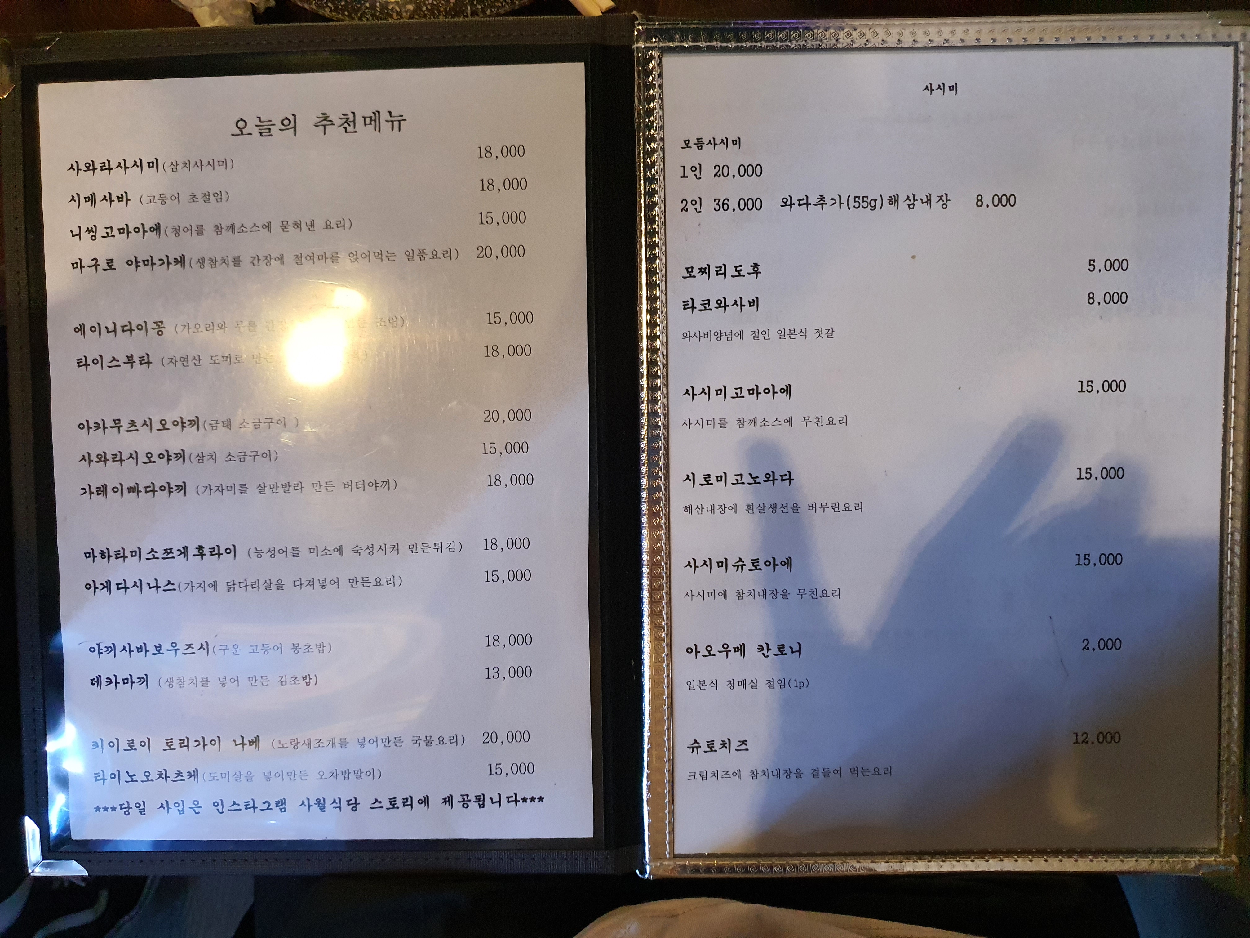오늘의 추천메뉴와 사시미