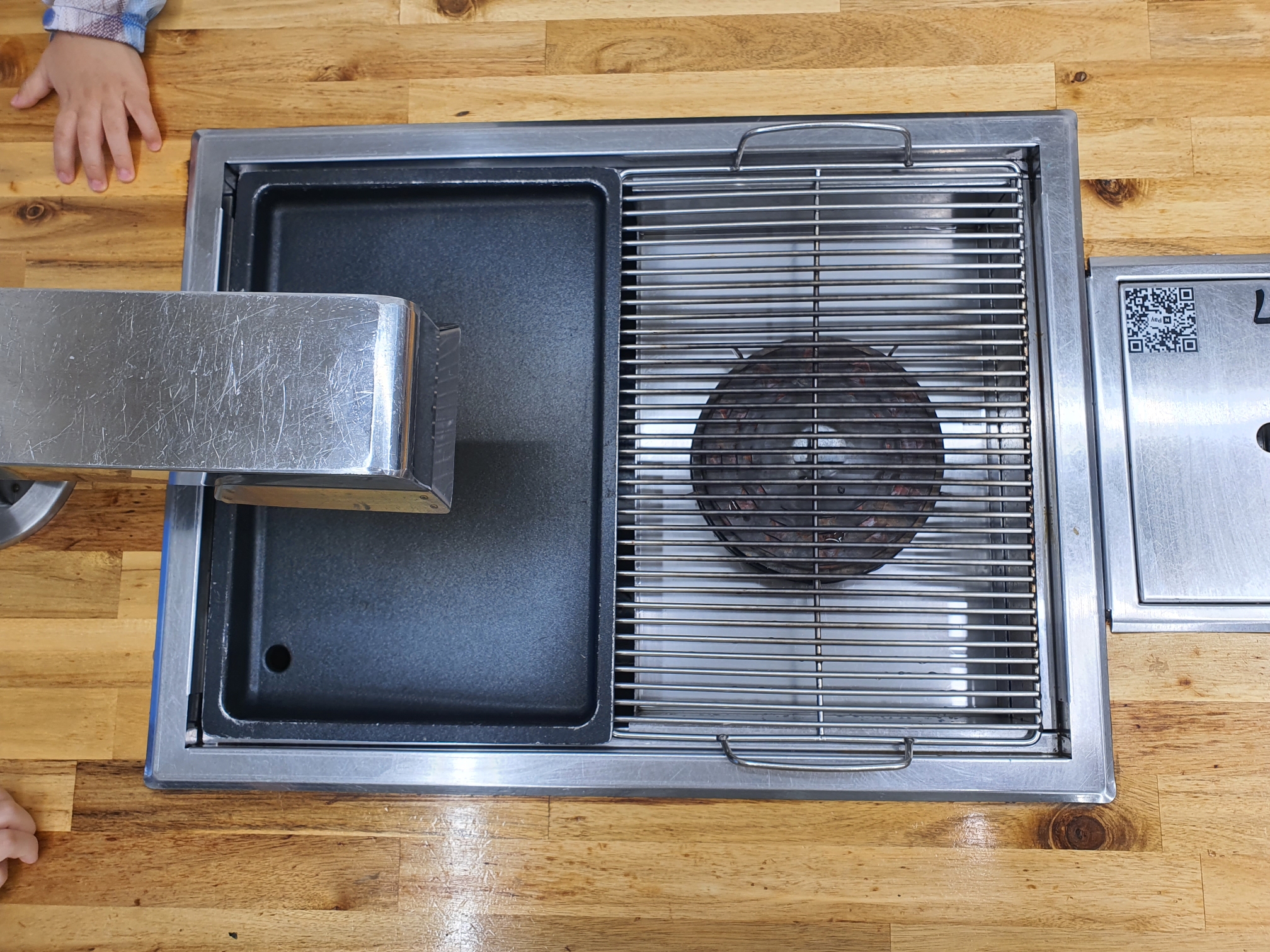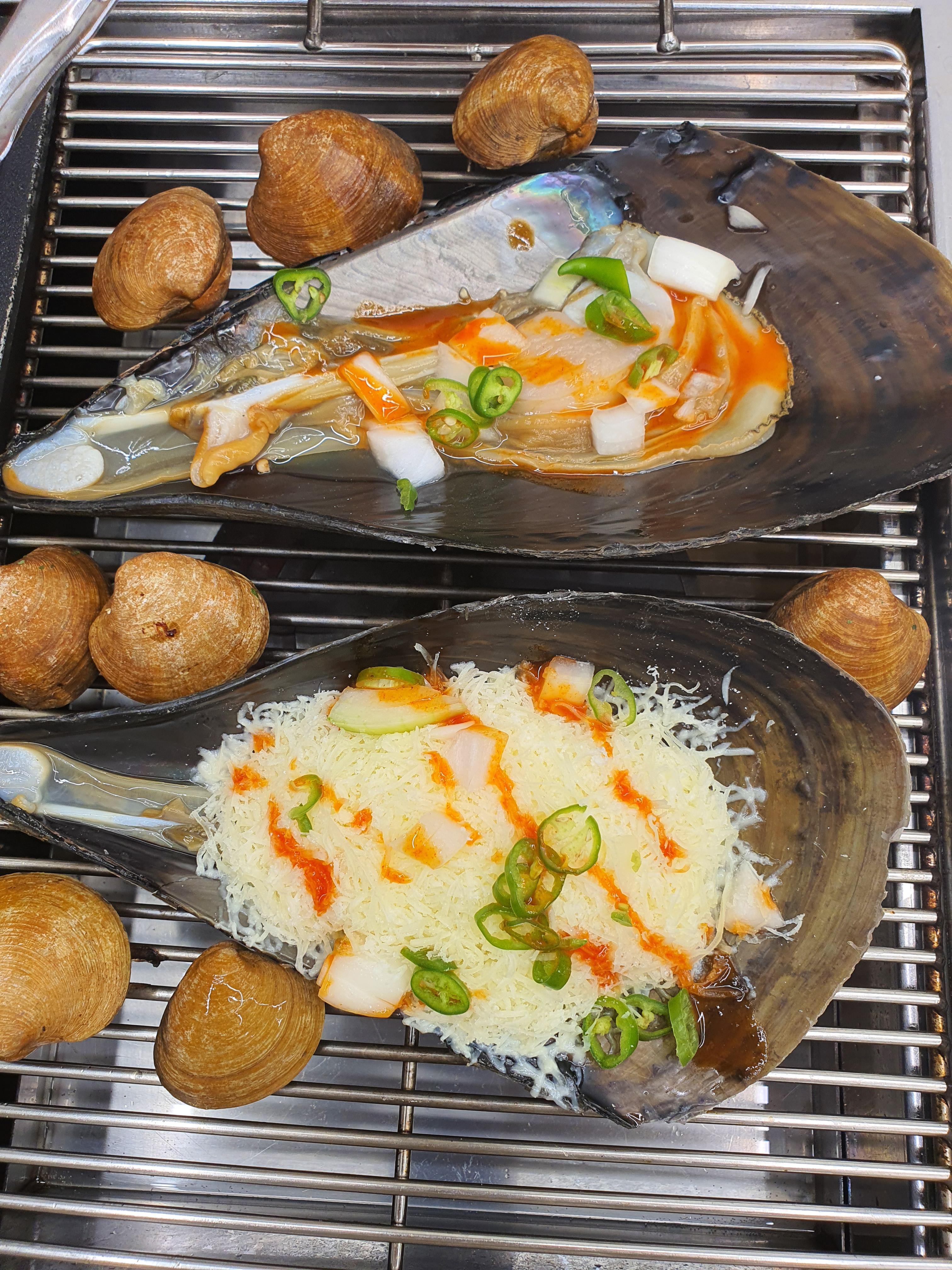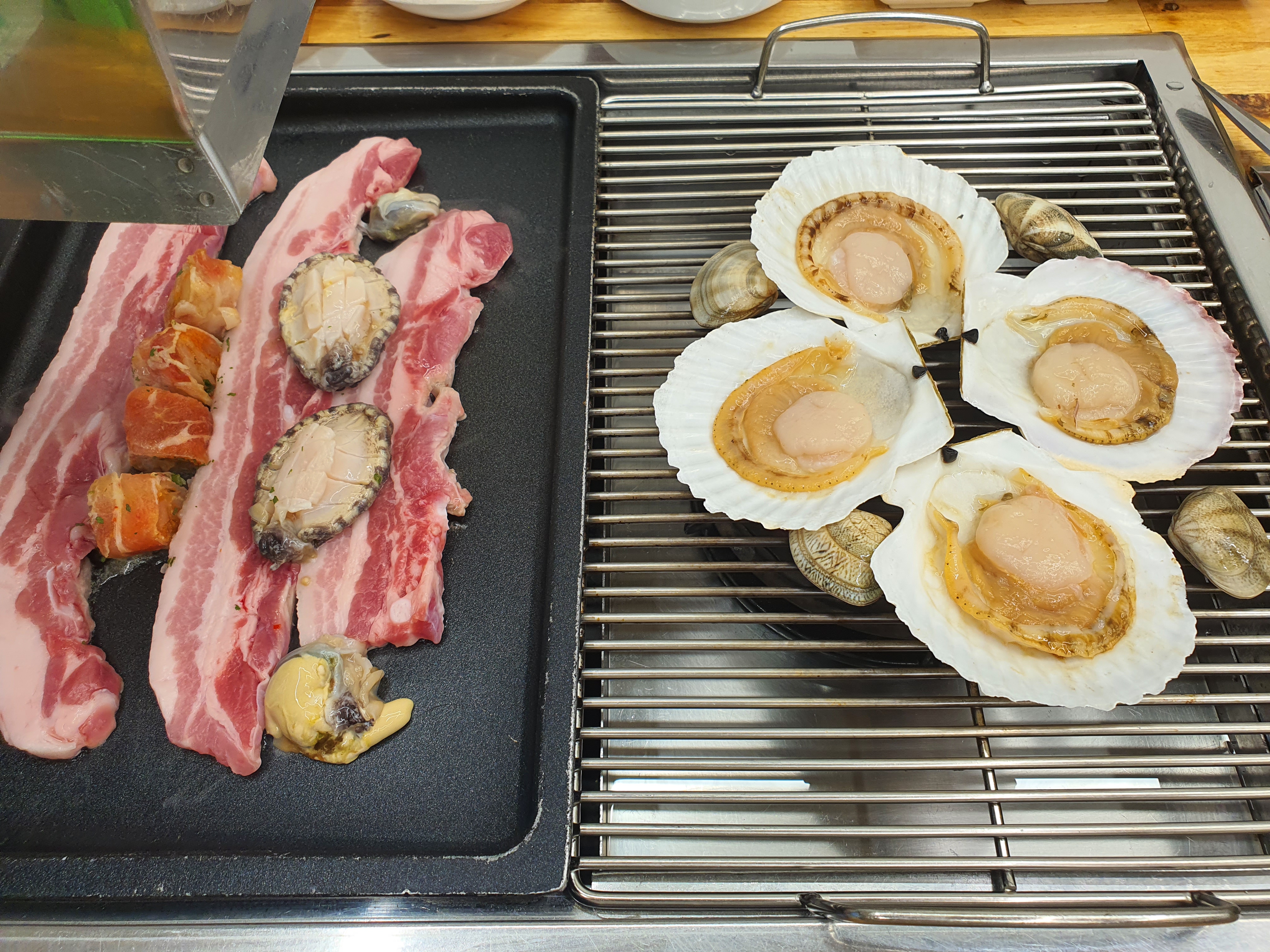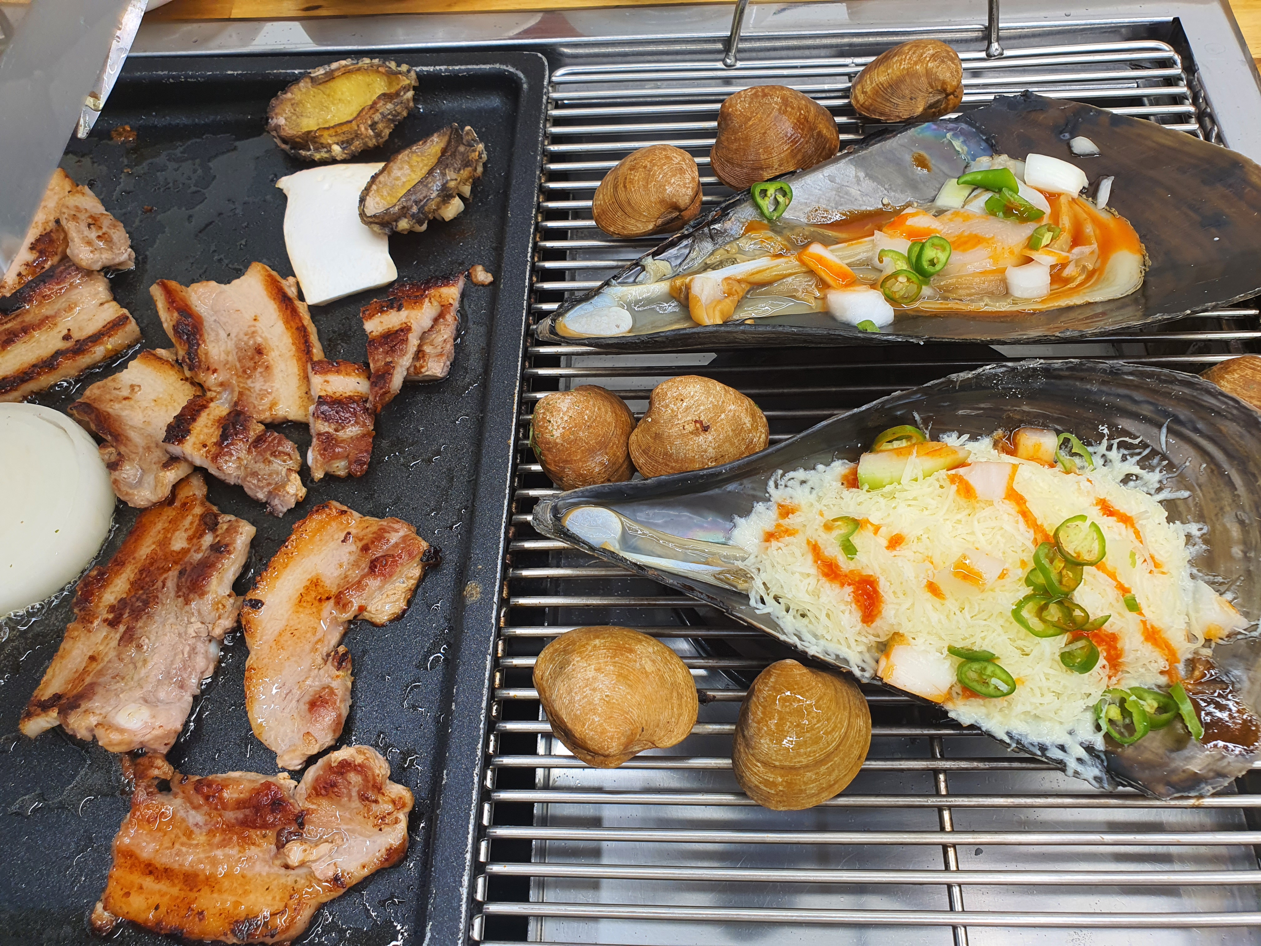 이런 불판에다 고기랑 조개를 동시에 굽는
