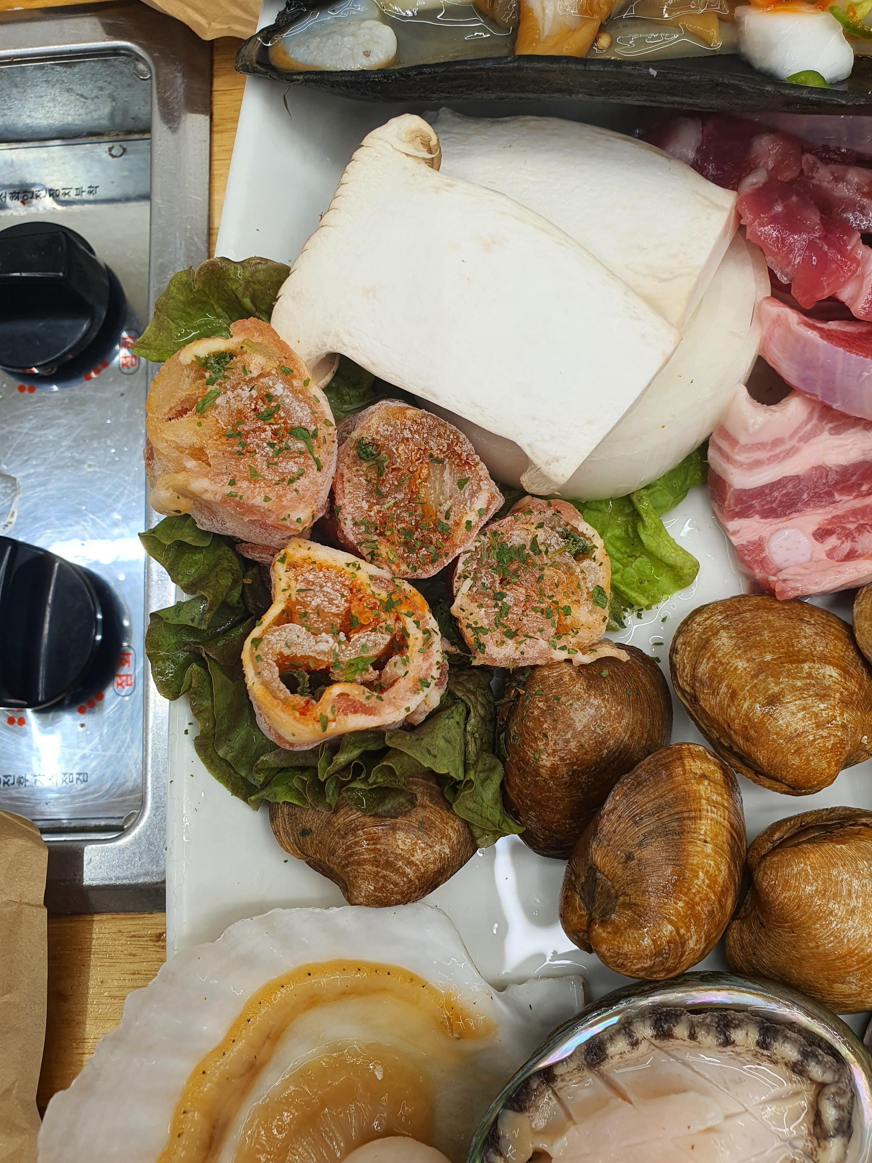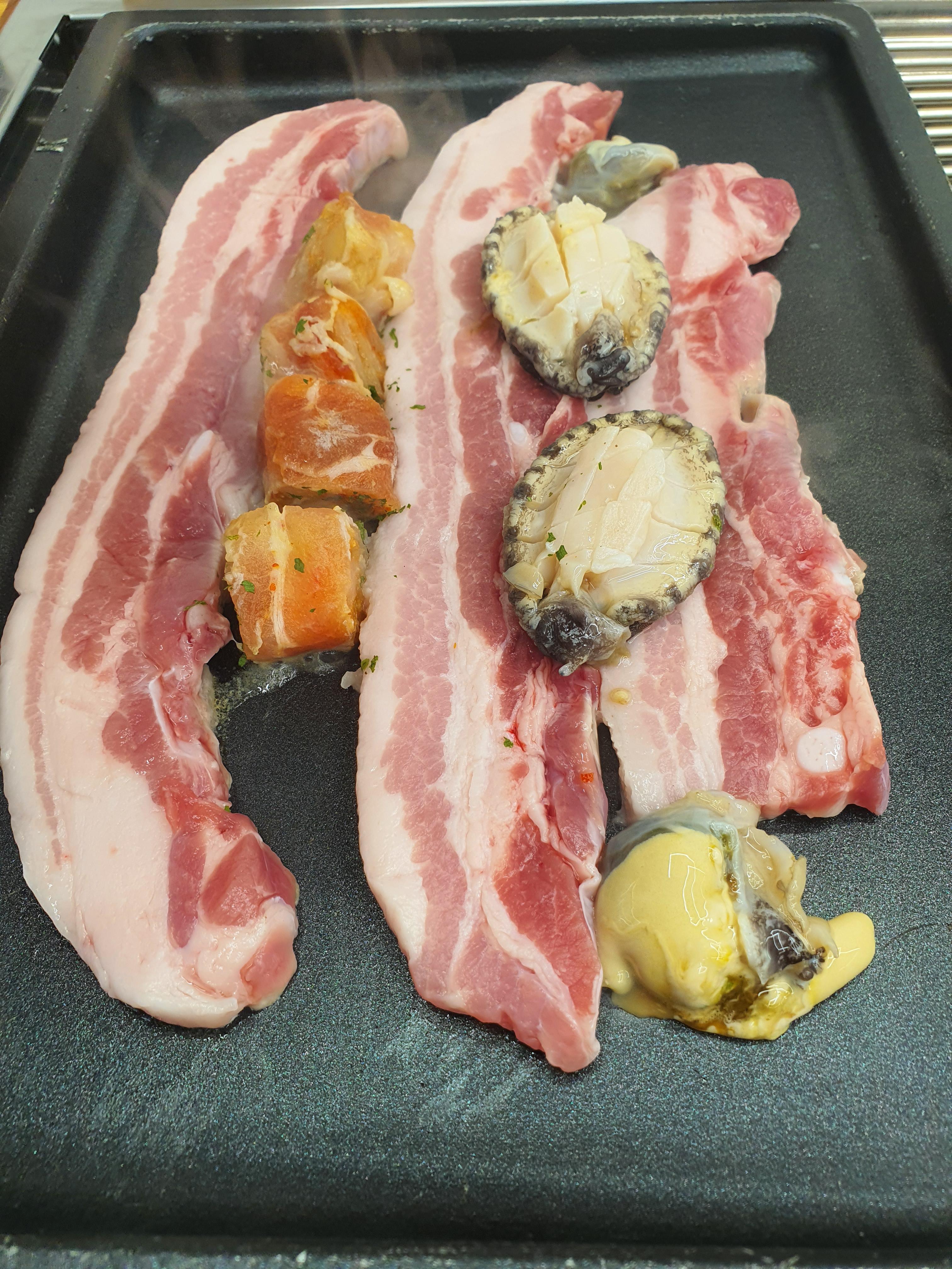 삼겹살과 꽃삼겹, 그리고 껍질을 제거한 전복은