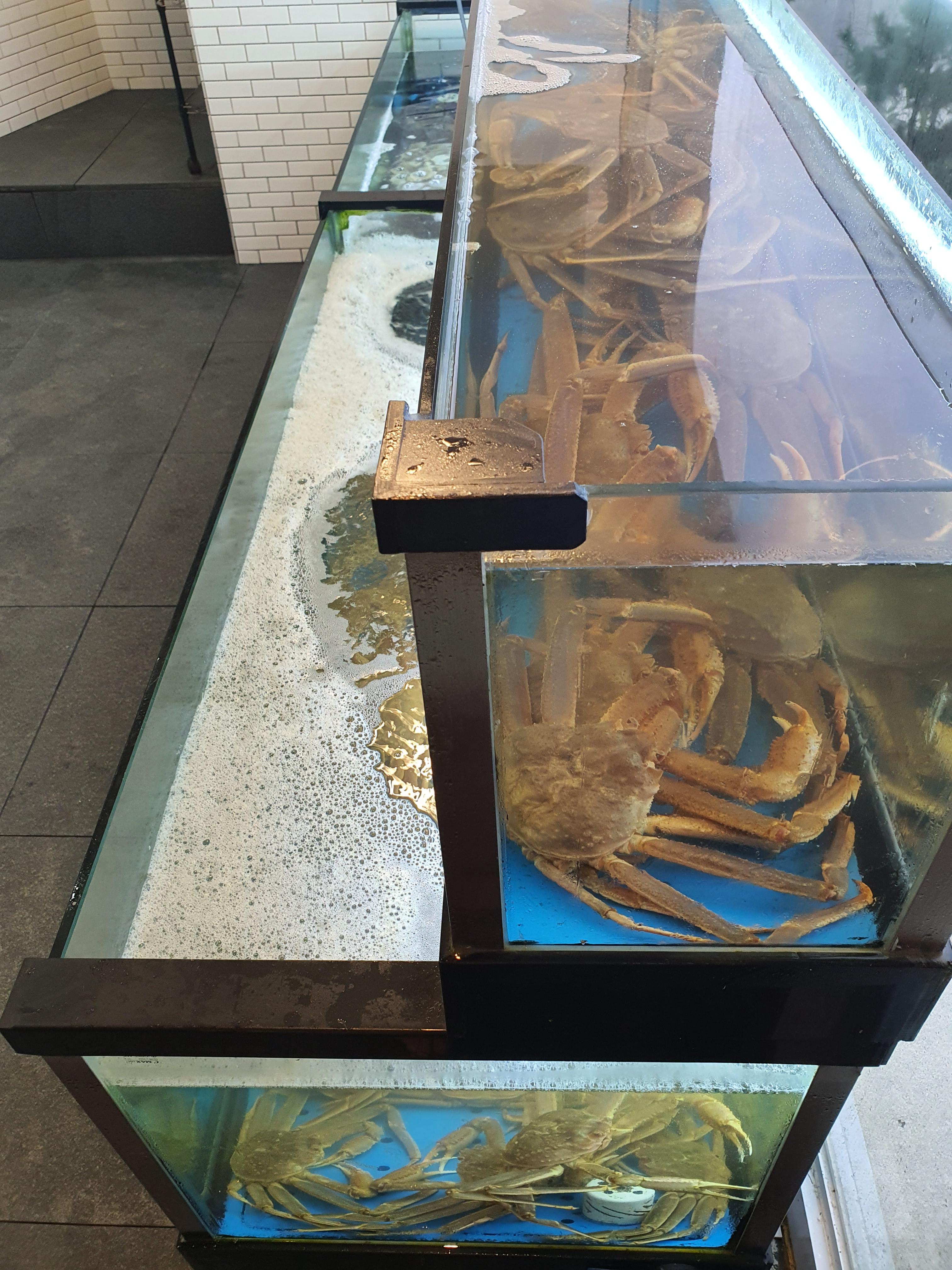 대게가 살아 움직이고 있어 아이들이 보고 있기에