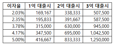중간 금액인 2억 대출시 월 338,333원 (2.03%)가