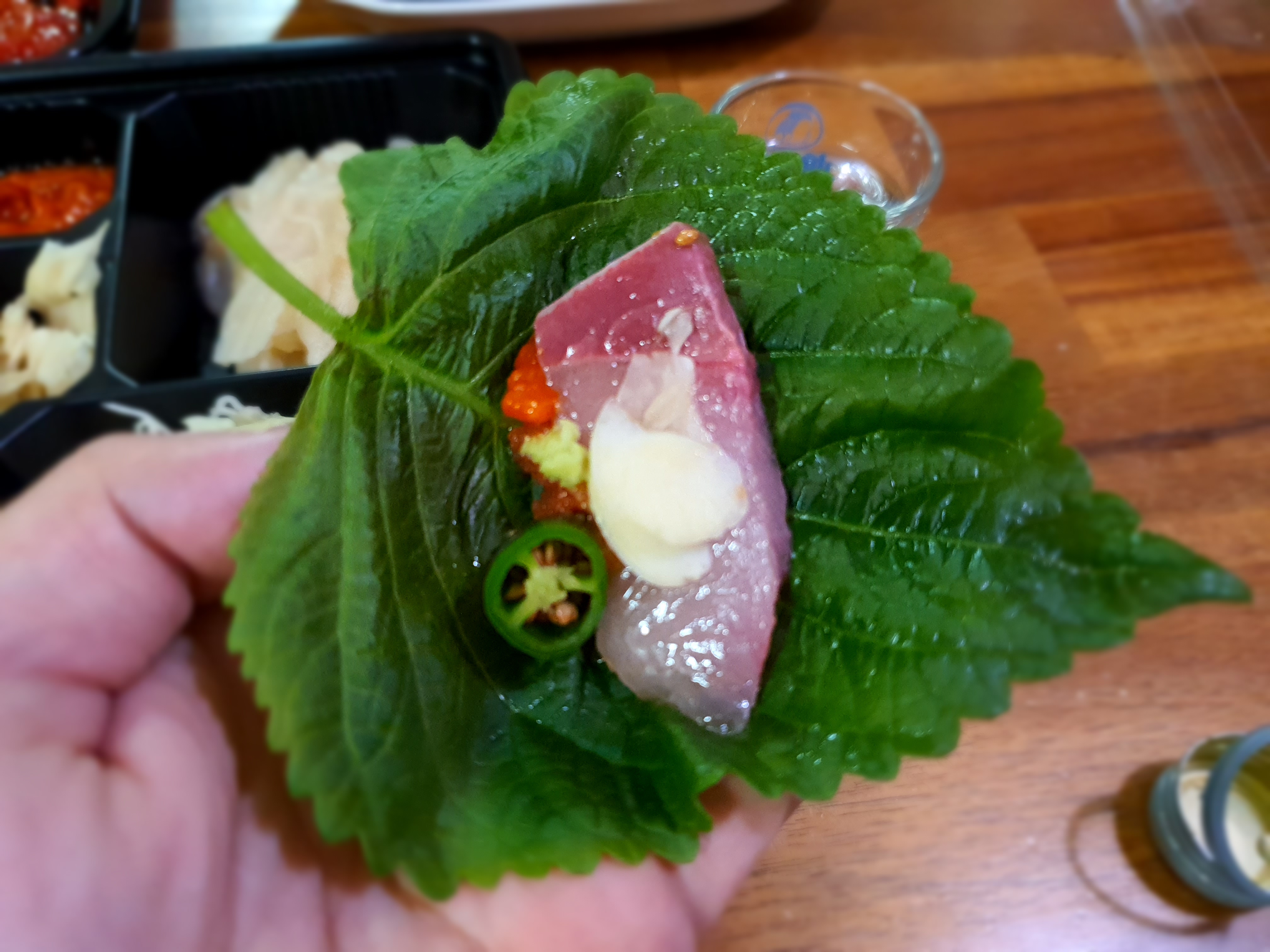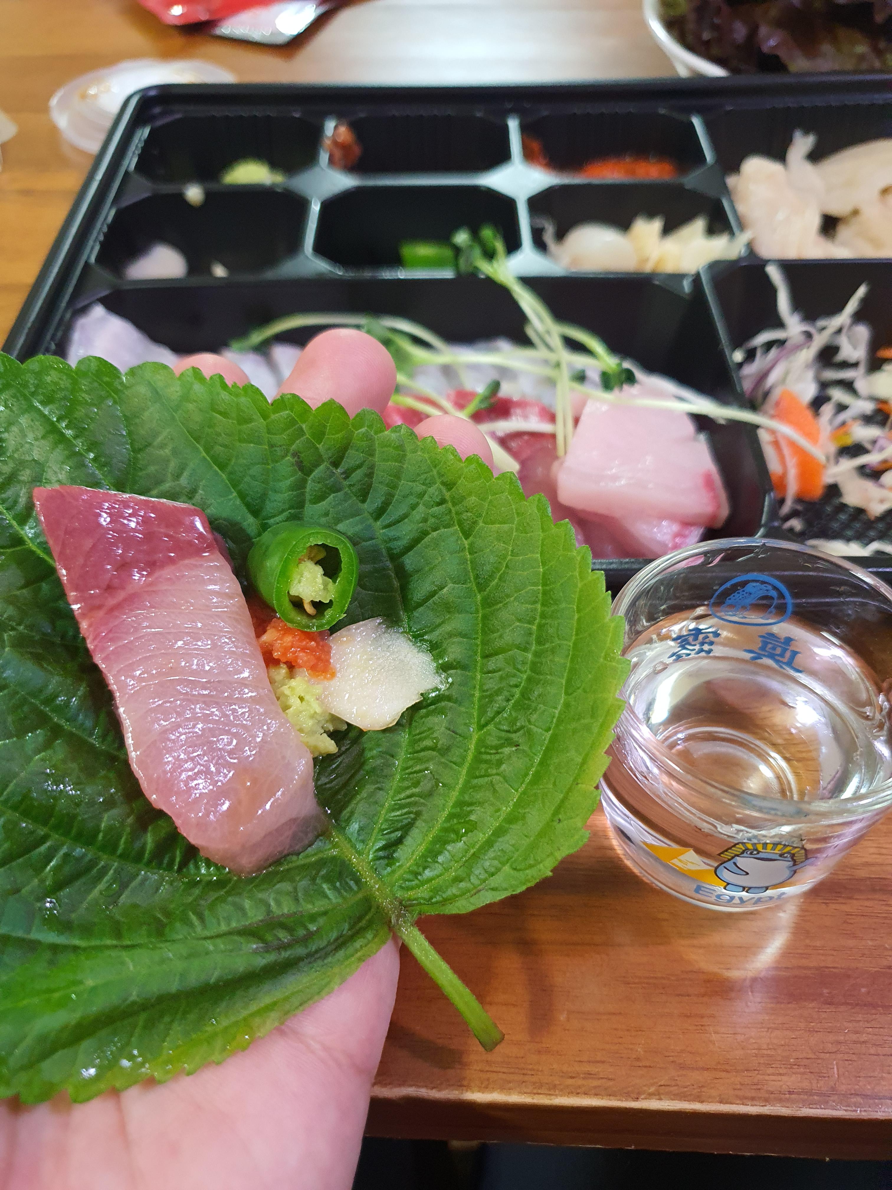 깻잎위에 올려주고 한잔 대기중.